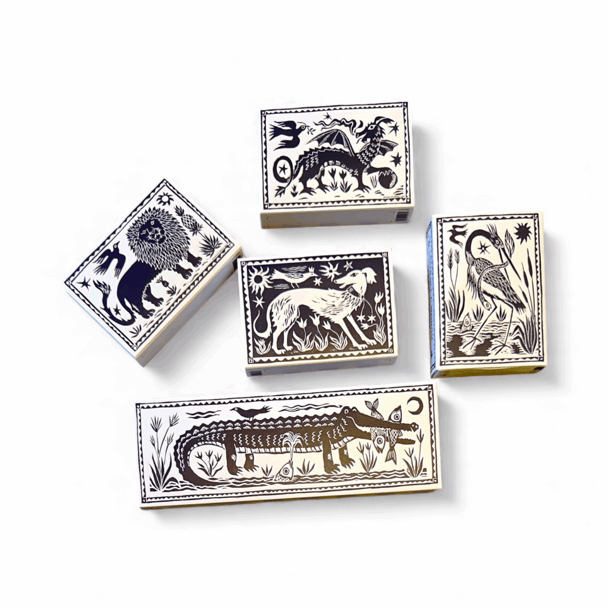 From the studio of the divinely talented Diana Catchpole, the queen of the linocut, we are delighted to show you our Birds & Beasties in all their glory. Originaly a linocut panel featuring all the designs as one we picked out some of our favouirtes (a hard task) and lucikly for us they fitted perfectly! We have used heavy debossing techniques & artisan board to produce this glorious letterpress effect across this very special range of matchboxes. The Happy Crocodile is a friendly fellow, sitting across the largest matchbox in our range, don’t let his toothy grin and pleasent demeanor fool you, he might still take a bite!